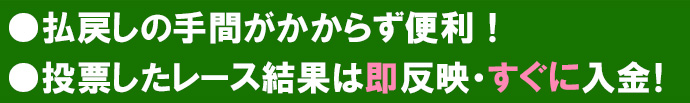 的中した払戻金はもちろん、欠場・フライング・出遅れ等が発生した場合の返還金も、レース確定後すぐにカード内へ自動入金されるので、払戻しの手間がかからず便利です。