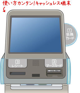 「キャッシュレス端末」のカード読み取り部に会員カードをかざし、画面の案内に従い4ケタの暗証番号を入力します。